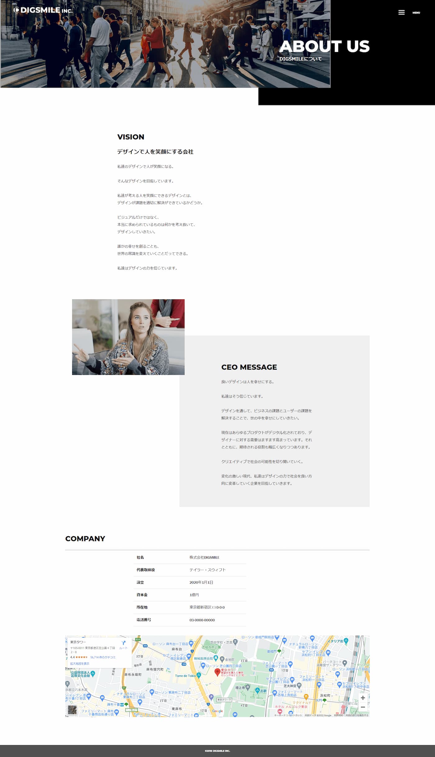 3ページでということだったのでメイン、アバウト、コンタクトの3つに分けてサイト移動がしやすいナビゲーションをつけてシンプルな作りで制作しました