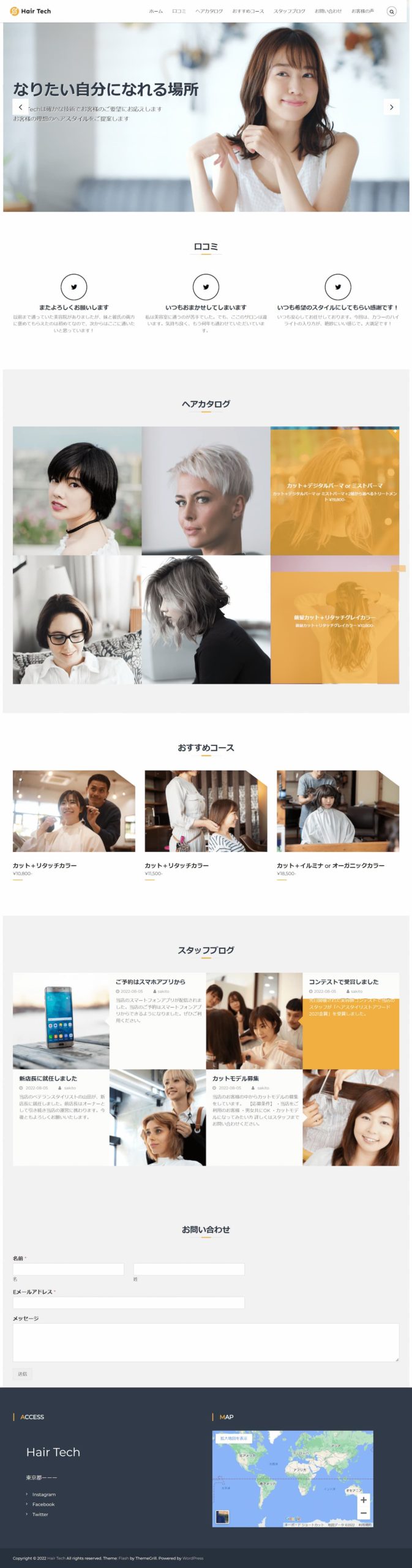 トップ画面での画像スライド、口コミ情報の表示、GoogleMapでの店舗所在地の表示、お問い合わせフォームなどを実装させていただいております。